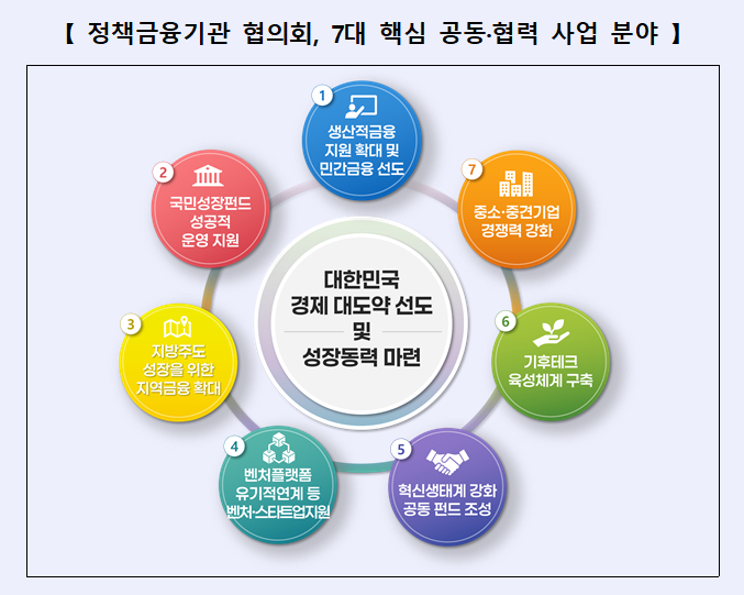 이 같은 지시에 따라 협의체는 이날 7대 핵심 사업 분야를 설정했다. 구체적으로 △생산적 금융 확대 △국민성장펀드 지원 △지역금융 확대 △벤처플랫폼 연계 △혁신생태계 펀드 조성 △기후테크 육성 △중소·중견기업 경쟁력 강화 등이다.