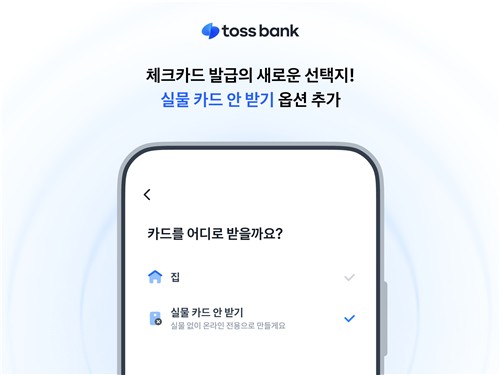 (서울=연합뉴스) 임지우 기자 = 인터넷전문은행 토스뱅크는 체크카드 발급 시 실물 카드를 받지 않을 수 있는 선택지를 제공한다고 27일 밝혔다.