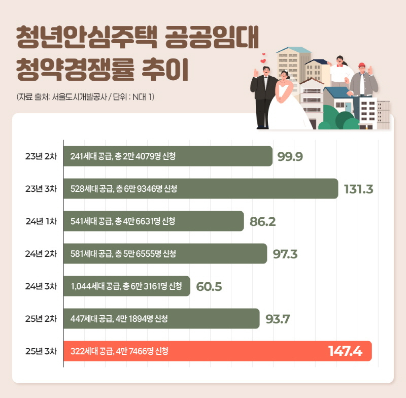 서울주택도시공사(SH)에 따르면, 2025년 진행된 청년안심주택 공공임대 청약은 322가구 모집에 4만 7466명이 접수해 147.4대 1의 경쟁률을 기록했다. 민간임대 부문에서도 지난해 공급된 ‘용산 남영역 롯데캐슬 헤리티지’가 91.6대 1의 경쟁률을 보이는 등 역세권 입지를 갖춘 임대주택에 대한 수요 쏠림 현상이 지속되고 있다.