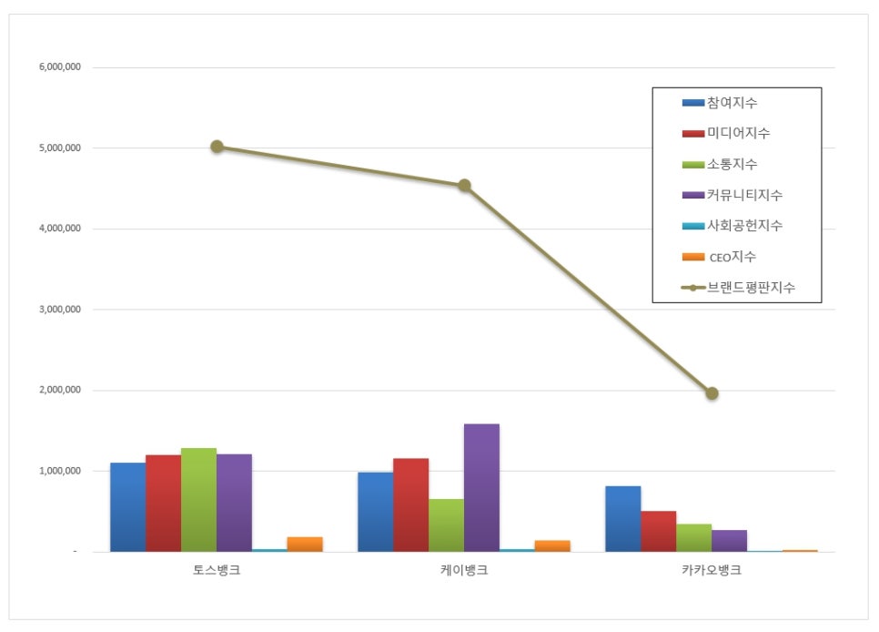 2위 케이뱅크는 브랜드평판지수 454만 1,325로 집계됐다. 참여지수 98만 204, 미디어지수 115만 4,466, 소통지수 64만 9,182, 커뮤니티지수 157만 8,708, 사회공헌지수 3만 5,142, CEO지수 14만 3,623을 기록하며 전월(135만 5,842)보다 234.95% 급등했다.