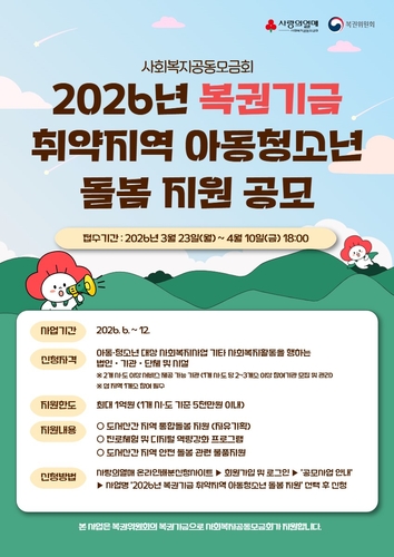 ▲ 사랑의열매 사회복지공동모금회는 복권위원회의 복권기금을 활용한 '2026년 취약지역 아동·청소년 돌봄 지원' 공모를 내달 10일까지 진행한다고 27일 밝혔다. 이는 도서 산간 및 인구감소지역 아동·청소년을 대상으로 통합 돌봄 서비스를 제공하고 지역 간 돌봄 격차를 완화하기 위해 마련됐다. 지원 규모는 총 1억원으로, '사랑의열매 온라인 배분신청시스템'을 통해 신청할 수 있다. (서울=연합뉴스)