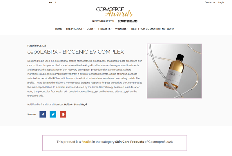 코스모프로프 어워즈 홈페이지에 최종 후보로 소개된 세포랩RX. 퓨젠바이오 제공 |