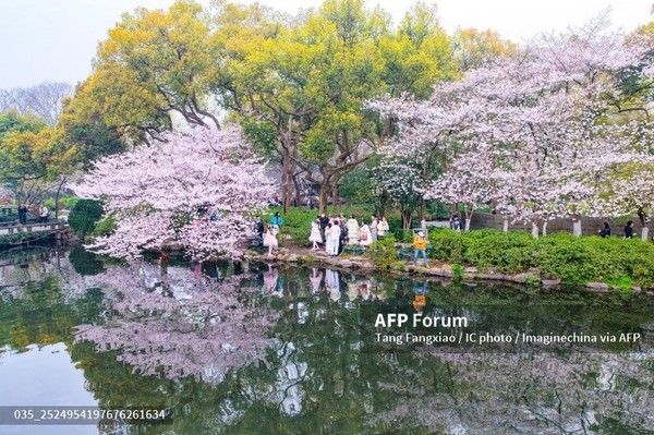 (중국=국제뉴스) 최철호 기자 = 벚꽃이 만개한 항저우의 취위안 정원은 26일(현지시간) 그림 같은 풍경을 선사하며 방문객들의 발길을 사로잡고 있다.
