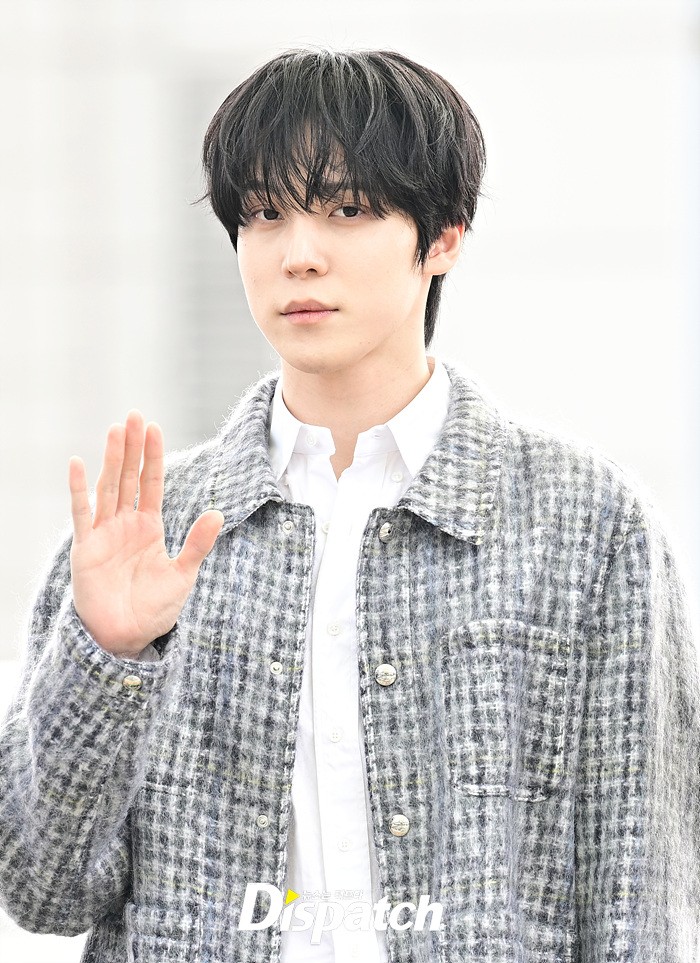윤호는 체크 패턴의 재킷과 슬렉스로 댄디한 공항패션을 완성했다. 큰 키와 작은 얼굴, 또렷한 이목구비도 돋보였다.