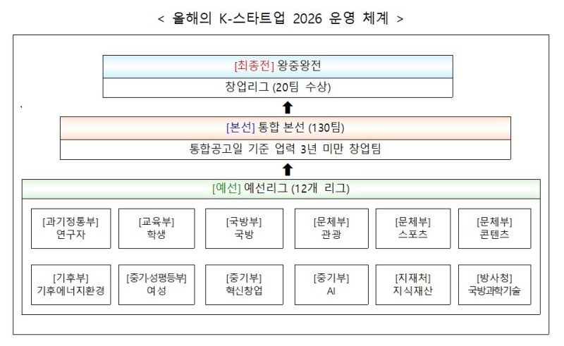 일정은 27일 통합공고를 시작으로 8월까지 부처별 예선리그를 진행한다. 이후 통합본선을 거쳐 12월 왕중왕전에 오를 20개팀을 추린다. 참가를 원하는 창업기업은 K-스타트업 누리집에서 공고를 확인하면 된다.