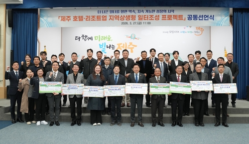 제주도는 27일 오전 도청 탐라홀에서 '제주 호텔·리조트업 지역상생형 일터 조성' 공동 선언식을 열었다.