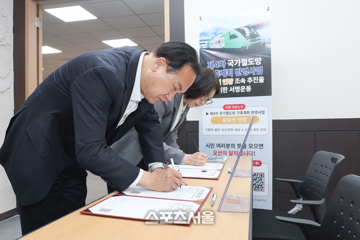 이권재 시장이 분당선 연장 필요성에 대한 서명 운동에 동참하고 있다. 제공=오산시 |