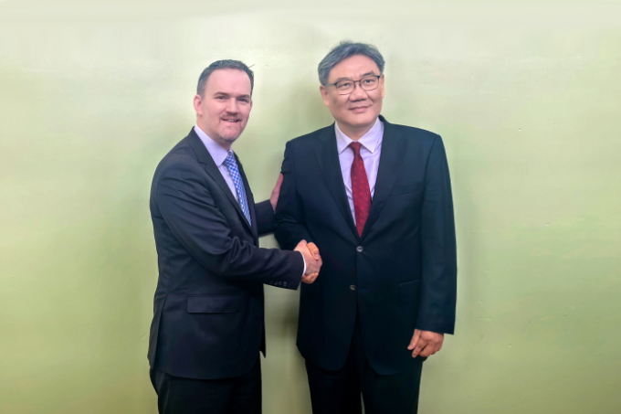 왕원타오 중국 상무부장(오른쪽)과 제이미슨 그리어 미국 무역대표부(USTR) 대표가 26일 카메룬 야운데에서 회동해 기념촬영을 하고있다./사진출처=중국 상무부 홈페이지 |