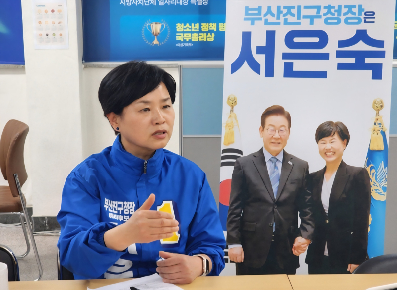 서은숙 부산진구청장 예비후보가 인터뷰에서 부산진구 구조 전환 필요성을 강조하고 있다. [사진=김정옥 기자] |