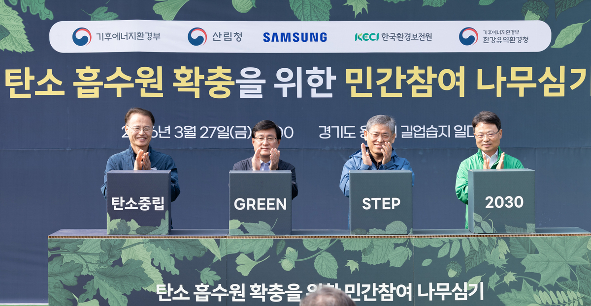 김성환 기후부 장관은 27일 김용관 삼성전자 DS부문 경영전략총괄 사장, 박은식 산림청장, 신진수 한국환경보전원장 등과 함께 경기 용인시 경안천 일원에서 ‘탄소흡수원 확충을 위한 민간 참여 나무심기 행사’를 개최했다. 기후부와 삼성전자는 이날 행사를 시작으로 5년간 전국에 약 26만 그루의 나무를 심는 민관 협력 식재사업을 펼칠 예정이다.