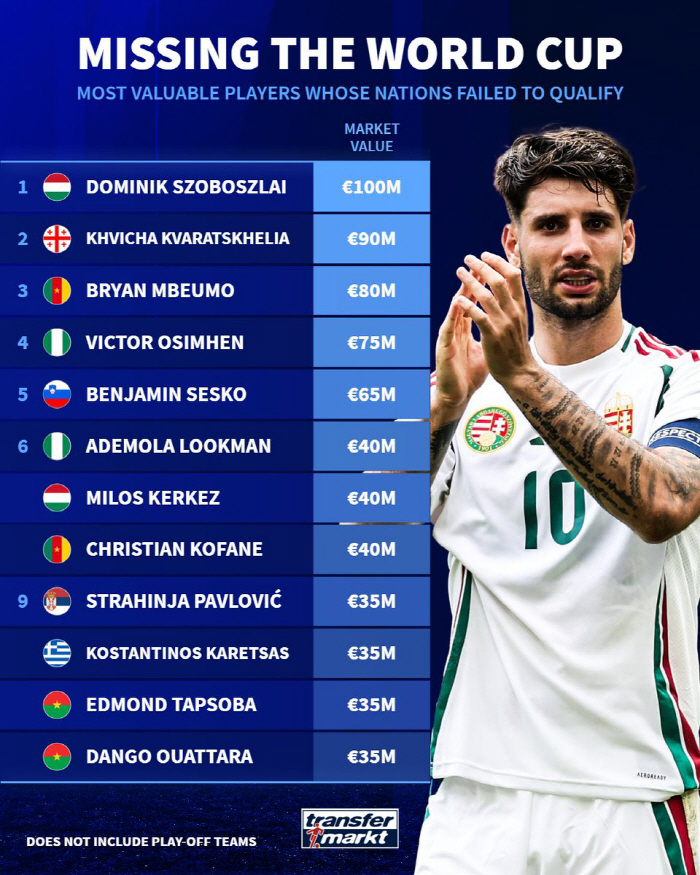 1위는 리버풀과 헝가리의 핵심인 도미니크 소보슬러이다. 소보슬러이는 무려 1억유로(약 1740억원)의 몸값을 자랑하는 슈퍼스타다. 공격형 미드필더 부분에서 세계 5위에 올라있다. 헝가리는 이변의 희생양이 돼 월드컵에 나서지 못했다. 월드컵 유럽예선 조별리그 최종전 아일랜드전에서 비기기만 해도 플레이오프 진출권을 확보할 수 있었지만 경기 종료 직전 역전골을 허용해 월드컵 꿈이 좌절됐다.