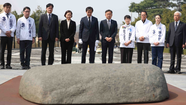 ▲조국혁신당 조국 대표와 지방선거 예비후보 등이 27일 오전 경남 김해시 진영읍 봉하마을 노무현 전 대통령 묘역을 참배하고 있다. ⓒ연합뉴스 |