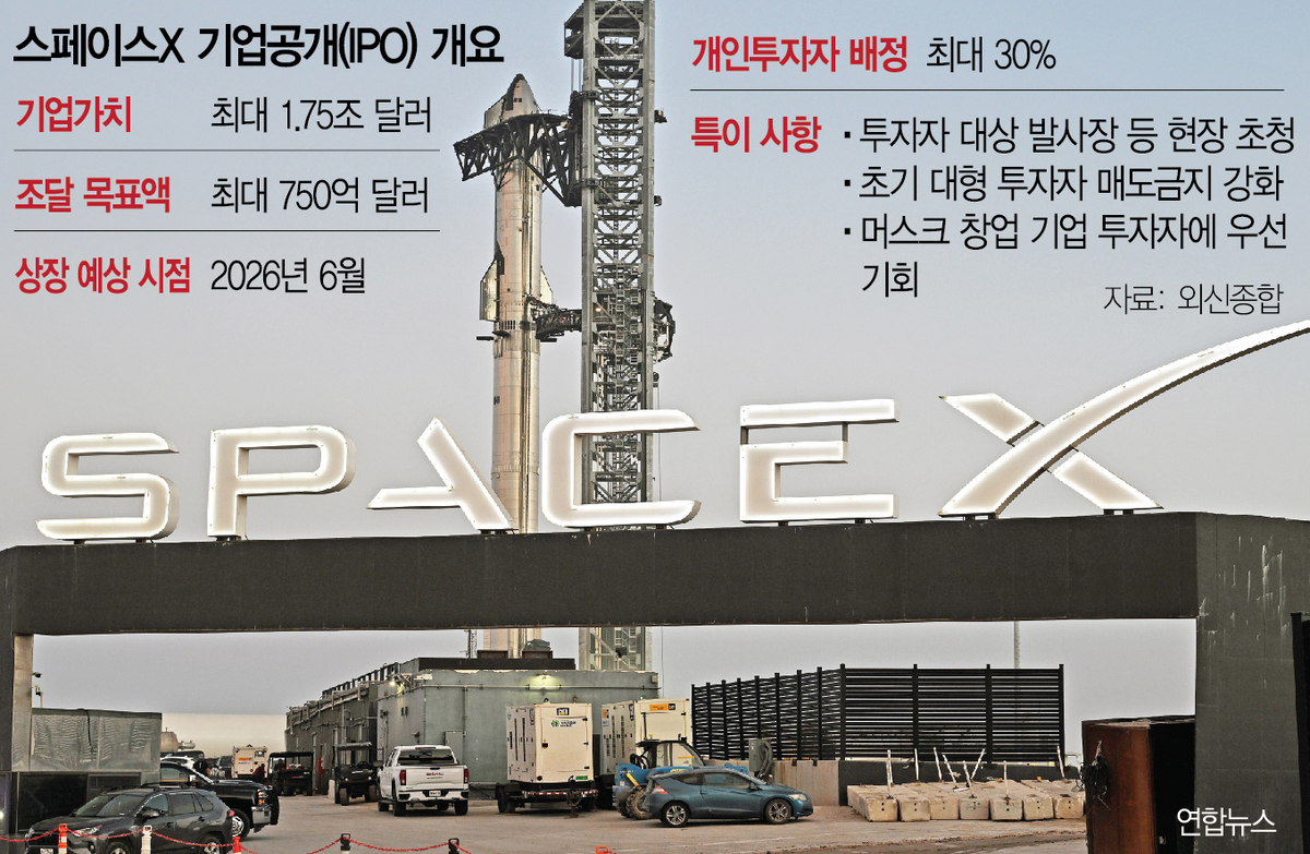스페이스X는 IPO로 750억 달러(약 112조 8900억 원)를 조달할 것으로 전망된다. 2019년 사우디아라비아 국영 석유 회사인 아람코가 세운 종전 최대 기록(290억 달러)을 훌쩍 넘는 규모다. 목표 시가총액은 1조 7500억 달러(약 2634조 9700억 원)다. 스페이스X는 지난달 기업가치를 높게 평가받기 위해 인공지능(AI) 스타트업 xAI와 합병했다.