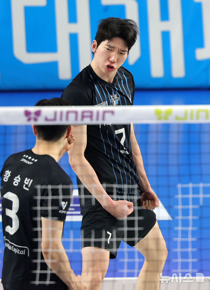[천안=뉴시스] 홍효식 기자 = 27일 충남 천안 유관순체육관에서 열린 2025-2026 V-리그 남자부 플레이오프 1차전 현대캐피탈과 우리카드의 경기, 현대캐피탈 허수봉이 득점에 포효하고 있다. 2026.03.27. yesphoto@newsis.com