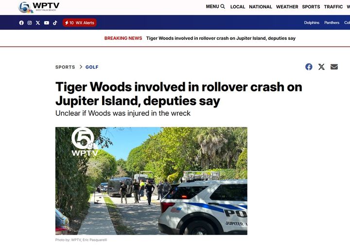 [워싱턴=뉴시스]지난해 수술을 받고 재활에 집중하던 '골프 황제' 타이거 우즈가 27일(현지 시간) 차량 전복 사고에 연루됐다고 현지 언론이 보도했다. 미국 플로리다주 웨스트팜비치 지역 방송국인 WPTV는 이날 오후 2시께 우즈가 주피터섬 도로에서 전복 사고를 당했다고 사진과 함께 보도했다. (사진=WPTV 홈페이지 캡쳐). 2026.03.28. *재판매 및 DB 금지 |