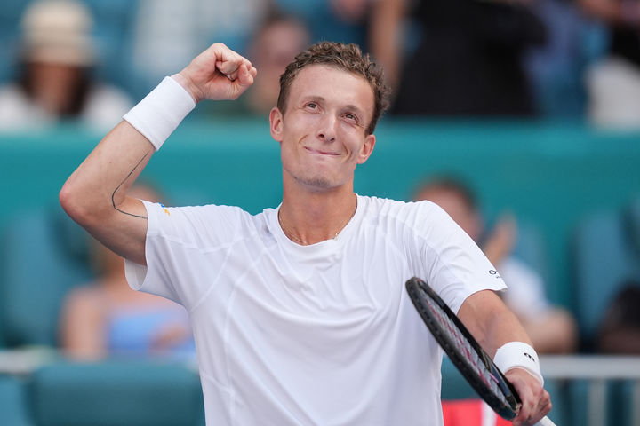 [마이애미가든스=AP/뉴시스] 이르지 레헤츠카(22위·체코)가 27일(현지 시간) 미 플로리다주 마이애미가든스에서 열린 남자프로테니스(ATP) 투어 마이애미 오픈 준결승에서 아르튀르 피스(31위·프랑스)를 꺾은 후 세리머니하고 있다. 레헤츠카가 2-0(6-2 6-2)으로 승리하고 생애 처음으로 ATP1000 마스터스 결승에 올랐다. 2026.03.28.