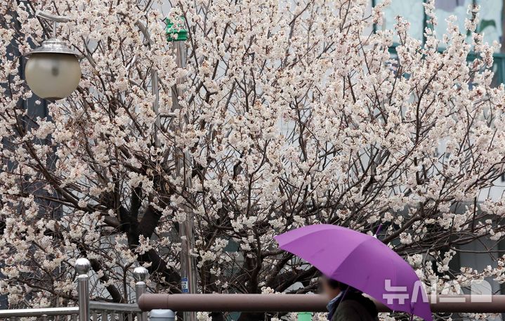 [부산=뉴시스] 하경민 기자 = 절기상 춘분을 이틀 앞두고 봄비가 내린 지난 18일 부산 부산진구의 한 주택가에서 시민이 우산을 쓴 채 활짝 핀 벚꽃 나무 아래를 지나고 있다. 2026.03.28. yulnetphoto@newsis.com |