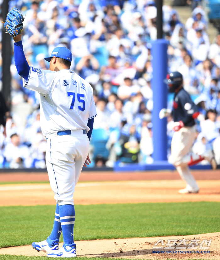 28일 대구 삼성라이온즈파크에서 열리는 삼성과 롯데의 개막전 경기. 1회 롯데 윤동희에게 선제 투런홈런을 허용한 삼성 선발 후라도. 대구=송정헌 기자songs@sportschosun.com/2026.03.28/ |