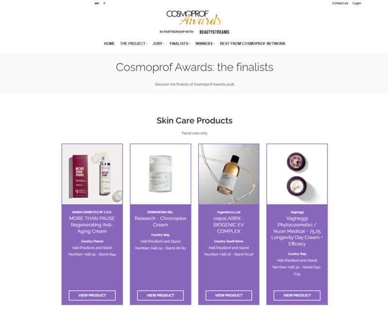 한편, 올해 코스모프로프 어워즈는 10개 카테고리에서 각 부문별 4개씩 총 40개 후보 제품을 선정했고, 세포랩RX를 포함한 국내 뷰티 제품 7개가 최종후보에 이름을 올렸다. 코스모프로프 어워즈는 전문 심사위원들이 제품을 혁신성, 지속성, 안정성, 성분, 디자인, 창의성 등 다양한 기준으로 까다롭게 평가하는 것으로 유명하다. 행사일로부터 12개월 이내에 출시된 신제품을 대상으로 한다.