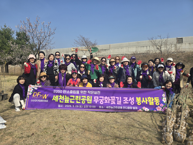 (사)대구미래인여성(회장 백란숙)은 대구시내 무궁화꽃길 조성을 위해 28일 오전 10시부터 달성군청에서 지정해준 “세천늪 근린공원” 일대에 무궁화꽃 나무묘목 100그루를 기증하고 식수하는 봉사활동을 펼쳤다.