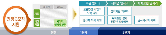 40대 이상 근로자와 구직자를 대상으로 한 ‘생애경력설계 서비스’와 전직을 원하거나 퇴직을 앞둔 이들에게는 ‘전직지원서비스’도 제공한다. 전직지원서비스의 경우 중소기업이나 비정규직 근로자는 국가가 제공하고 대기업은 해당 기업에서 의무적으로 제공하도록 제도화한다. 이와 함께 올해 약 2500개의 신중년 경력형 일자리를 새롭게 만들고 귀농이나 귀어 등 다양한 퇴직 후 일자리를 지원할 계획이다.