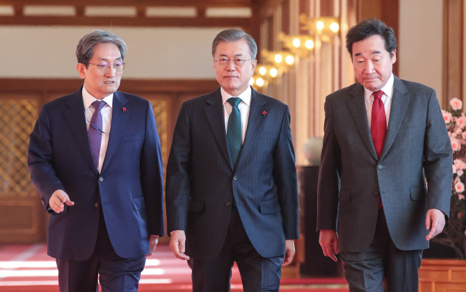 문재인 대통령과 이낙연 국무총리, 노영민 비서실장이 22일 오전 청와대에서 열린 국무회의에 입장하고 있다. (사진=연합뉴스) |