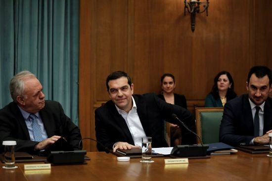 28일(현지시간) 그리스 아테네 의회에서 열린 내각 회의에 참석한 알렉시스 치프라스 총리(가운데)와 관계자들의 모습 [이미지출처=로이터연합뉴스] |