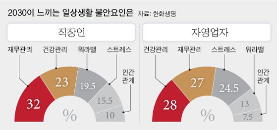 건강에 대한 염려도 자영업자 쪽이 더 컸다. 자영업자는 일상생활 불안요소 1위로 건강(28.0%)을 꼽았다. 직장인은 재무관리(32.0%)를 가장 불안하게 여겼다. 자영업자의 건강 염려증은 건강식품 소비로 이어졌다. 카드사 데이터를 분석한 결과 자영업자는 건강식품 구매에 연간 38만9000원을 썼다. 직장인(15만5000원)의 2.5배 수준이다.