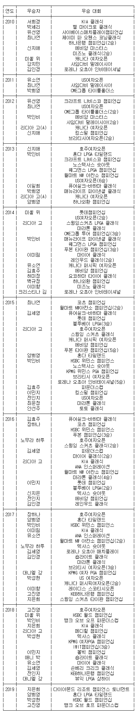 [표] 최근 10년간 LPGA 투어 한국(계)선수 우승 일지