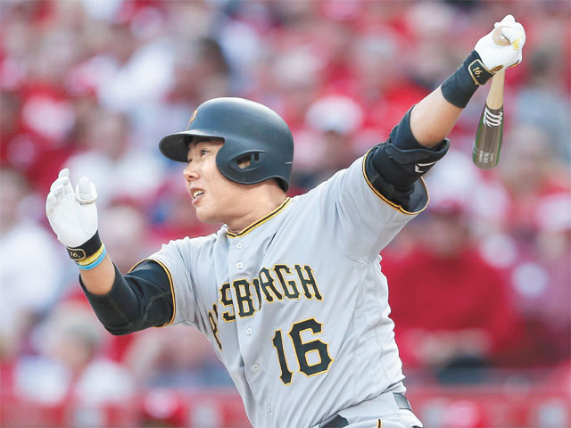 피츠버그의 강정호가 29일 신시내티와의 2019 메이저리그 개막전에서 6회초 상대 구원 투수 재러드 휴스를 상대로 2타점 적시타를 날리고 있다. 강정호는 이날 6번 타자 3루수로 선발출장해 3타수 1안타 2타점을 기록했다. 하지만 피츠버그는 3-5로 졌다. 신시내티=AP 뉴시스 |