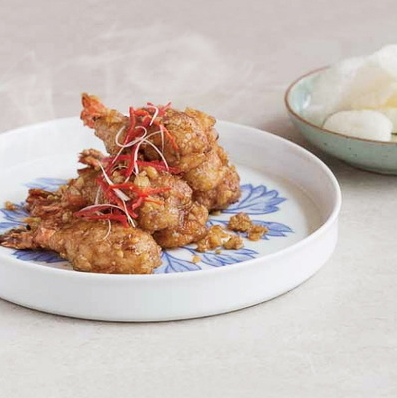 7. 팬을 달궈 다진 대파(1큰술), 다진 생강을 넣고 향이 나게 볶은 후 소스 재료를 넣고 센 불에서 끓어오르면 튀긴 새우를 넣어 버무린다.
