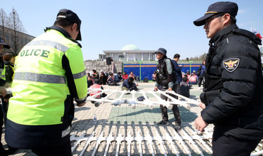 3일 민주노총 조합원들이 국회 앞에서 노동법 개악 저지 등을 촉구하며 경내 진입을 시도하다 철문이 뜯겨졌다. 경찰들이 시위현장에서 파손된 철문을 옮기고 있다. 연합뉴스 |
