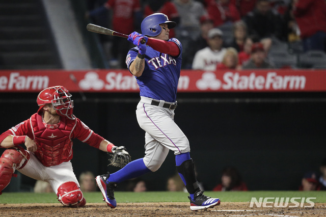 【애너하임=AP/뉴시스】 텍사스 레인저스의 추신수가 6일(한국시간) 미국 캘리포니아주 애너하임의 에인절스타디움에서 열린 2019 메이저리그(MLB) LA 에인절스와의 경기에서 5회초 안타를 때려내고 있다. |