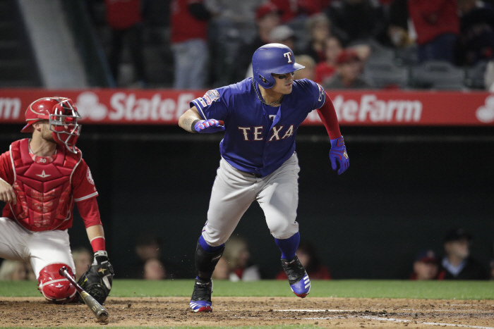 Texas Rangers' Shin-Soo Choo, of South Korea, heads to first with a single during the fifth inning of the team's baseball game against the Los Angeles Angels, Friday, April 5, 2019, in Anaheim, Calif. (AP Photo/Jae C. Hong) |
