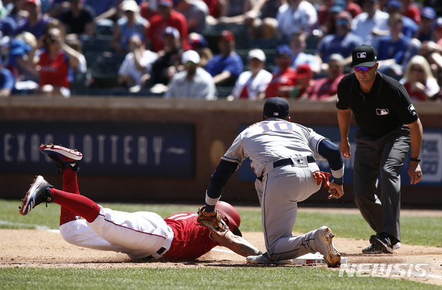 【알링턴=AP/뉴시스】텍사스 레인저스의 추신수(왼쪽)가 21일(현지시간) 미 텍사스주 알링턴 글로브라이프파크에서 열린 2019 메이저리그(MLB) 휴스턴 애스트로스와의 경기 3회 볼넷으로 걸어 나가 견제에 귀루하고 있다. 추신수는 1번 타자 우익수로 선발 출전해 3타수 1안타 2볼넷을 기록했고 텍사스는 11-10으로 신승했다. 2019.04.22. |