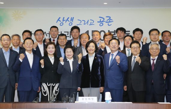 박영선 중소벤처기업부 장관(첫번째줄 오른쪽에서 네번째), 김기문 중소기업중앙회 회장(첫번째줄 오른쪽에서 세번째) 등이 25일 오전 서울 여의도 중소기업회관에서 열린 간담회에 참석해 카메라를 향해 자세를 취하고 있다. |