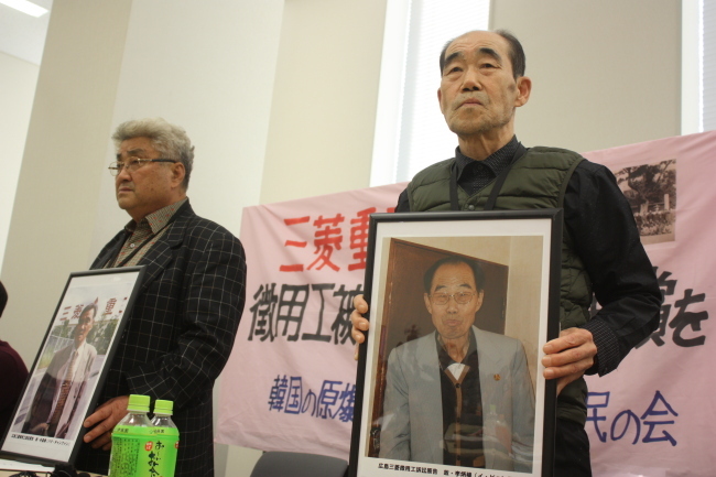 지난 2월 일본 도쿄의 참의원 의원회관에서 열린 ‘한국 대법원판결에 대해 생각하는 원내집회’에서 강제징용 소송 원고의 유족인 박재훈(왼쪽), 이규매 씨가 피해자의 사진을 들고 있다.[연합뉴스] |