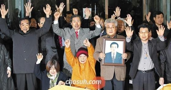 대법원이 2018년 11월 29일 일제 강제징용 피해자들이 미쓰비시 중공업을 상대로 낸 손해배상 청구소송에서 원고 승소 판결을 한 원심을 확정했다. 이 같은 판결이 나온 직후 서울 서초구 대법원 앞에서 강제징용 피해자들과 법정대리인 등이 만세 삼창을 하고 있다. /조선DB |