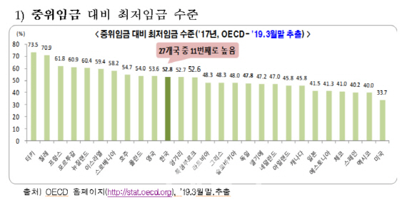 이 장관은 가장 최근 발표된 OECD 통계가 2017년 기준이라며 중위임금 대비 최저임금 수준은 52.8%로 27개국 중 11위라고 설명했다,