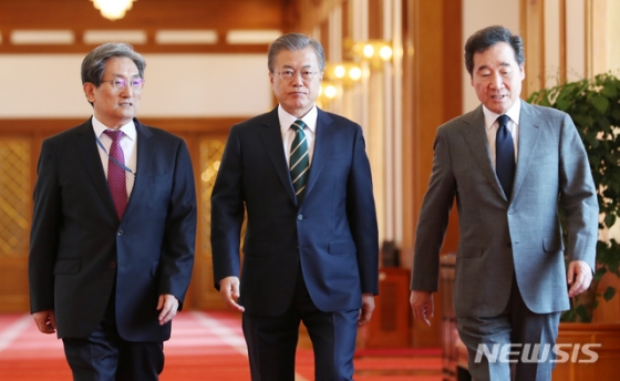 【서울=뉴시스】박진희 기자 = 문재인 대통령이 14일 청와대 본관에서 열린 국무회의에 입장하고 있다. 왼쪽부터 노영민 비서실장, 문 대통령, 이낙연 국무총리. 2019.05.14. pak7130@newsis.com |