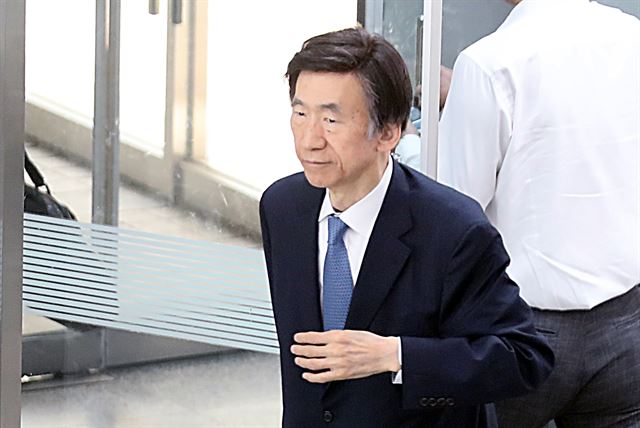 윤병세 전 외교부장관이 14일 오후 서울 서초구 서울중앙지방법원에서 열린 직권남용권리행사방해 등 혐의로 기소된 임종헌 전 법원행정처 차장 공판에 증인으로 출석하고 있다. 뉴스1 |