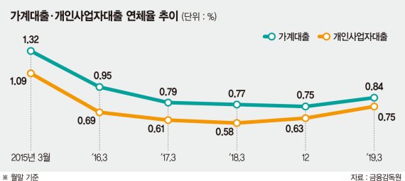 가계대출과 개인사업자대출 연체율은 지난해보다 상승했다. 올해 1·4분기 말 가계대출 연체율은 0.84%로 지난해 말 0.75%보다 올랐다. 4년전인 2013년 1·4분기 2.12% 이후 지난해 3월까지 매년 감소했지만 올들어 상승하면서 2017년 3월 연체율(0.79%) 수준을 넘어섰다.