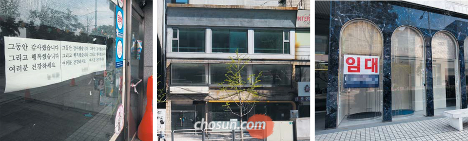 문 닫으면서도 “행복했습니다”, 梨大앞 건물 통째 공실, 청담동도 ‘텅’ - 내수(內需) 경기 침체에다 정부가 밀어붙인 소득 주도 성장의 충격까지 겹치면서 자영업자들의 빚덩이는 불어나고, 서울 도심까지 빈 상가가 속출하고 있다. 폐업하면서 감사 인사를 진열장에 붙인 종로구 삼청동 상가(왼쪽), 건물 전체가 비어 있는 이대앞 상가 건물(가운데), 고급 외장재로 멋을 냈지만 공실(空室) 신세를 못 피한 강남구 청담동 상가(오른쪽) 모습. /조인원 기자 |