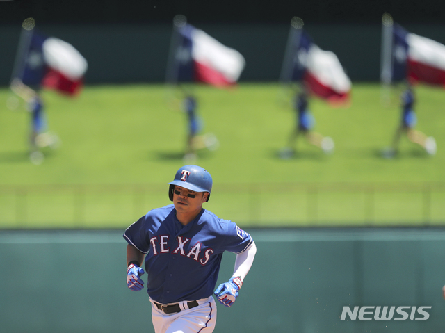 【알링턴=AP/뉴시스】 텍사스 레인저스의 추신수가 20일(한국시간) 미국 텍사스주 알링턴의 글로브 라이프 파크에서 열린 2019 메이저리그(MLB) 세인트루이스 카디널스와의 경기에서 1번 타자 겸 좌익수로 선발 출전, 1회말 솔로 홈런을 때려낸 뒤 그라운드를 돌고 있다. |