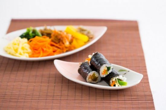 6. 접시에 볶은 김치, 멸치볶음, 우엉조림, 당근, 단무지, 지단, 시금치 무침, 김을 먹음직스럽게 담고 밥과 함께 준비한다. |