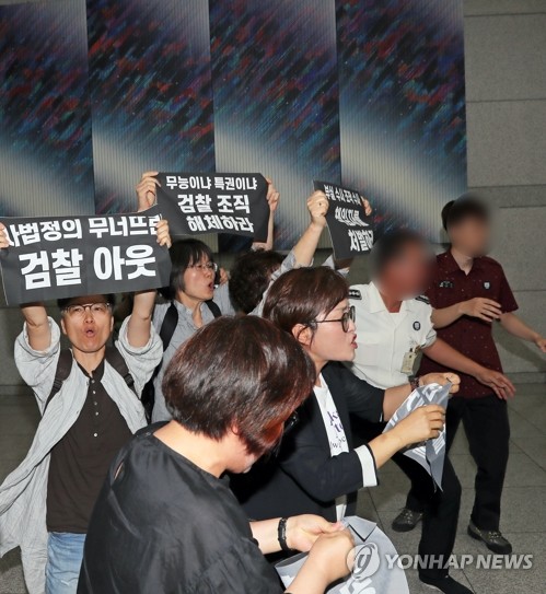 한국여성민우회와 한국여성의전화 등 여성단체 회원 10여명은 이날 오후 2시께 서울 서초구 대검찰청 민원실 앞 로비에서 '검찰이 공범이다', '사법정의 무너뜨린 검찰 아웃', '검찰조직 해체하라' 등의 문구가 적힌 손현수막을 들고 시위를 벌였다.