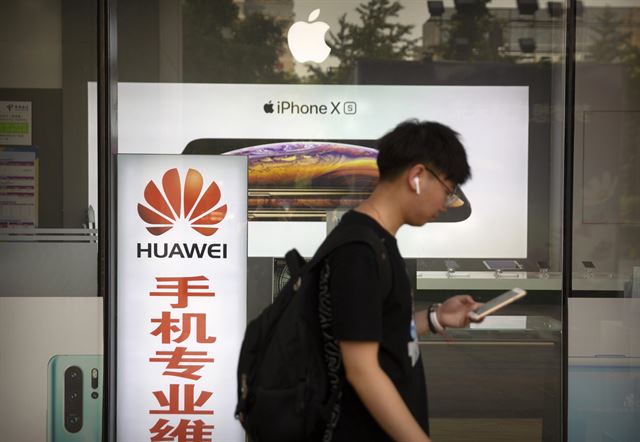 24일 중국 베이징에서 한 남성이 스마트폰을 바라보면서 화웨이, 애플 광고판이 설치된 매장 앞을 지나가고 있다. 베이징=AP 연합뉴스 |
