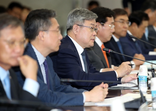 이재갑 고용노동부 장관(왼쪽에서 세번째)이 29일 오후 서울 중소기업중앙회에서 열린 중소기업인 간담회에서 인사말을 하고 있다./ 연합뉴스 |