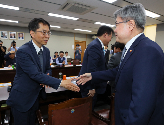 이재갑 고용노동부 장관(사진 오른쪽)이 30일 세종시 정부세종청사 최저임금위원회 전원회의실에서 열린 최저임금위원 위촉장 전수식에서 박준식 한림대 사회학과 교수와 인사하고 있다. 박 위원은 이어진 전원회의에서 신임 최저임금위원장으로 선출됐다. 연합뉴스 제공. |