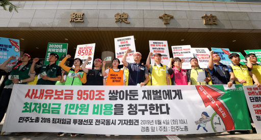 민주노총은 또 “현재 최저임금은 가족 생계비 기준 50%에도 못 미치고 있다”며 “재벌은 중소상공인과 최저임금 노동자를 이간질하면서 책임을 떠넘기지 말아야 한다”고 강조했다.